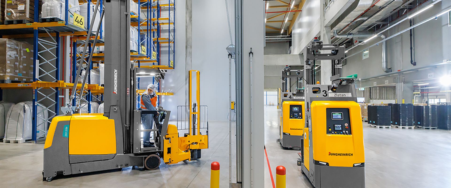Jungheinrich ha implementato uno speciale processo "handshake" per garantire una perfetta interazione tra carrelli automatici e manuali. Quando i carrelli per corsie strette segnalano un cambio di corsia, tutti i Mobile Robot vengono automaticamente guidati fuori dall'area e rilasciati solo quando il carrello è rientrato nella propria corsia.