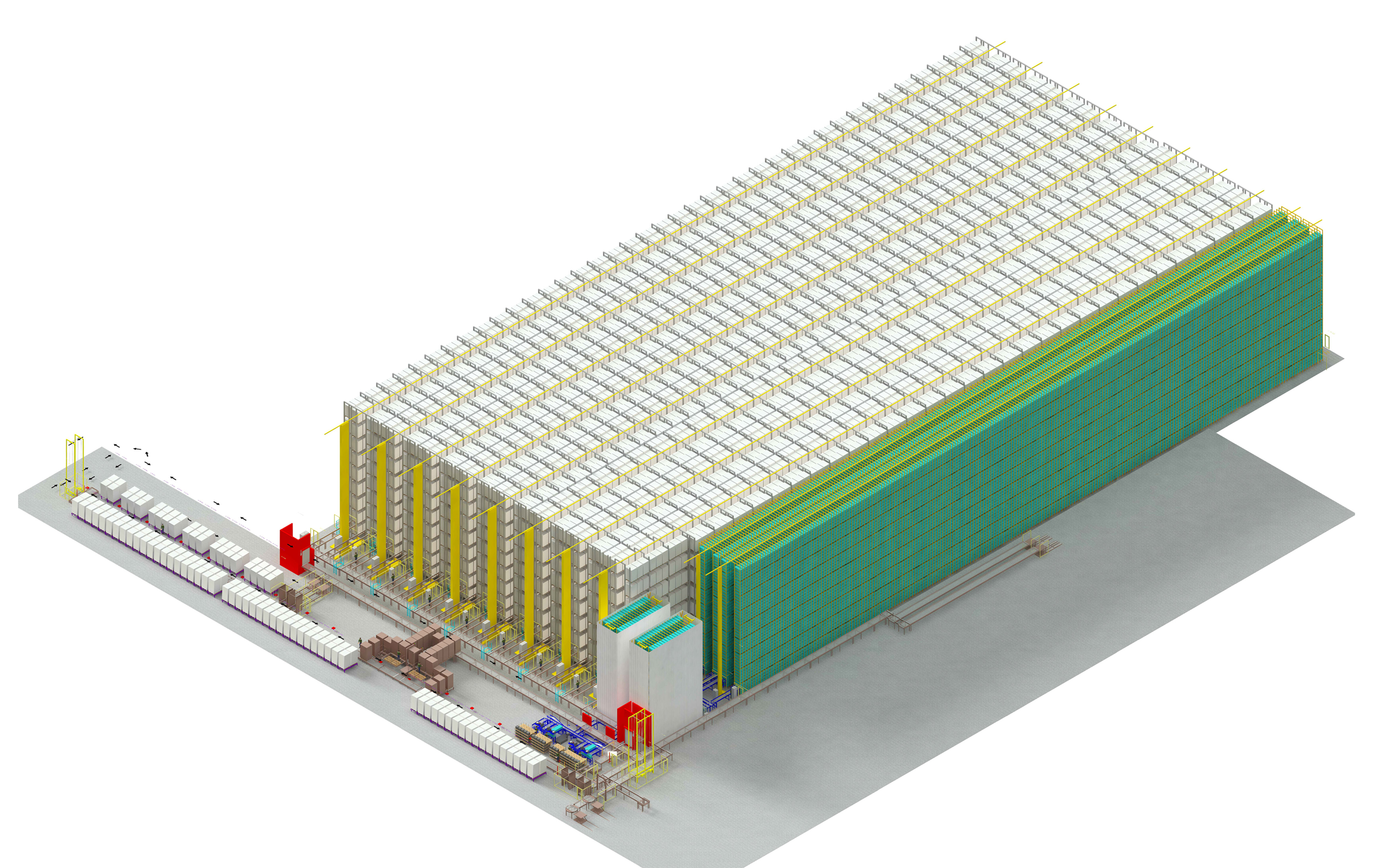 • Magazzino automatico a grandi altezze con 35.000 posti pallet e composto da otto corsie