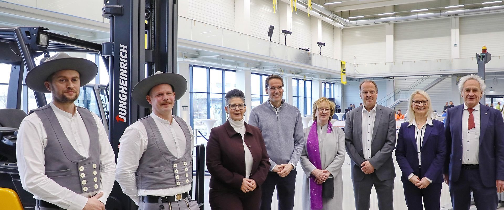 Foto: Da sinistra a destra: Marco Eigel (Foreman, Leonhard Weiss), Kai Gurrath (Foreman, Leonhard Weiss), Nadine Despineux (Chief Sales Officer, Jungheinrich AG), Dr Tobias Harzer (Chief Automation Officer, Jungheinrich AG), Linda Duffy (Vice President Marketing, Jungheinrich AG), Richard Brandstetter (Managing Director, Jungheinrich Logistiksysteme GmbH), Magdalena Finsterhölzl (Head of Jungheinrich Experience Center Planning, Jungheinrich Logistiksysteme GmbH), Helmut Petz (District Administrator, District of Freising).