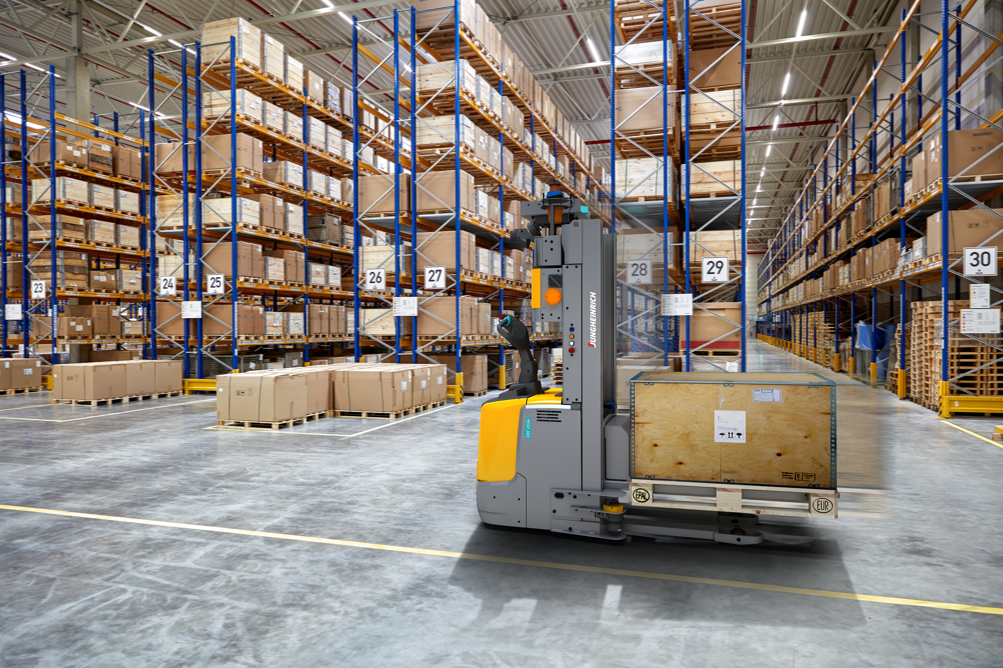 Grazie al suo design compatto, l’ERC 213a è l’ideale per le operazioni in corsie strette e può sollevare carichi fino a 1.300 kg ad un’altezza massima di 3.800 mm. Il potente motore di sollevamento controllato elettricamente assicura un sollevamento e un abbassamento delicato e silenzioso, anche ad altezze così elevate. I carrelli vengono guidati da un efficiente software di controllo. La navigazione avviene mediante la tecnologia laser. Per questo, lungo il percorso di 700 m sono installati vari riflettori che gli ERC 213a possono sfruttare per orientarsi nello spazio.